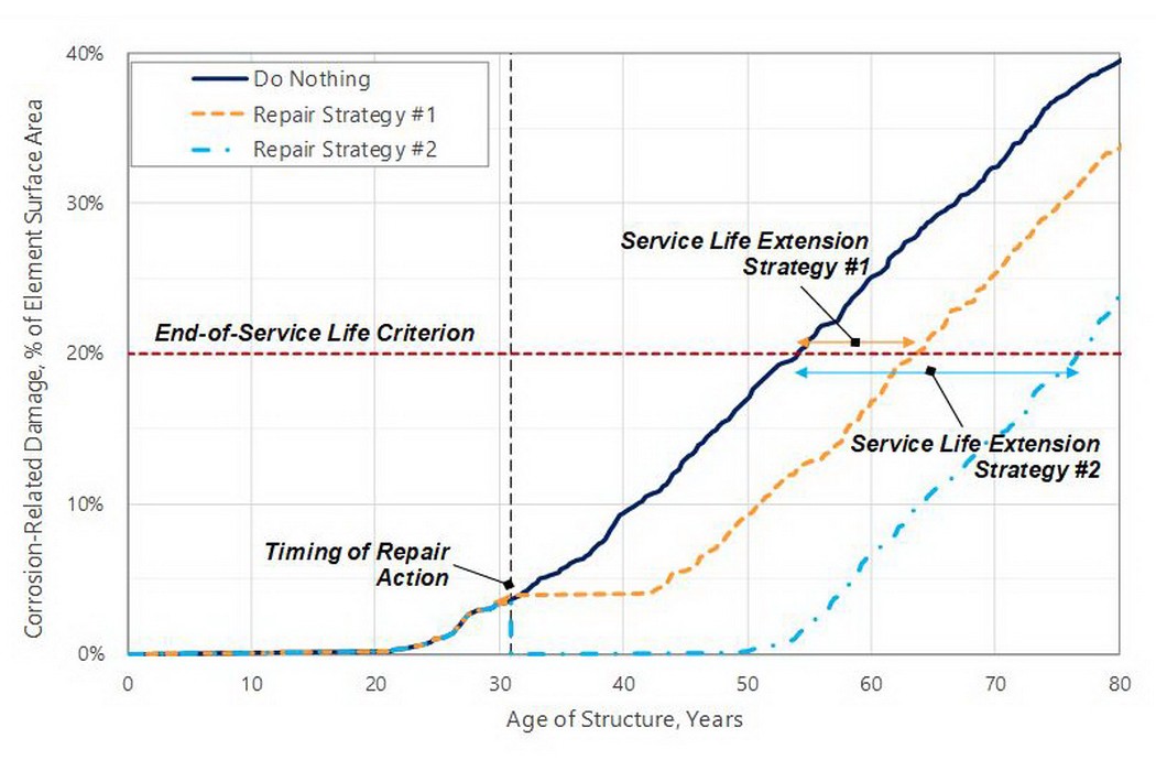 In the case of existing structures, this approach is used to predict the amount of concrete surface area or percentage of elements affected by corrosion-related damage. This recognizes that corrosion is a local process that can develop at multiple locations on a structure with time. The predicted damage is compared to the project-defined service life requirement.