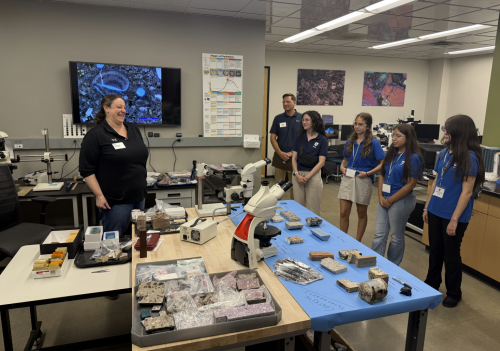 Materials engineer Elizabeth Wagner welcomed everyone to the concrete lab, where she explained that her colleagues were engaged in understanding how to make the strongest, most durable concrete for projects. Students handled materials that could be mixed into concrete, such as gypsum and fly ash. Then, petrographer Corrie Piehowski showed students the Thermotron and explained how it can simulate environmental exposure for materials before she led the students through other areas.