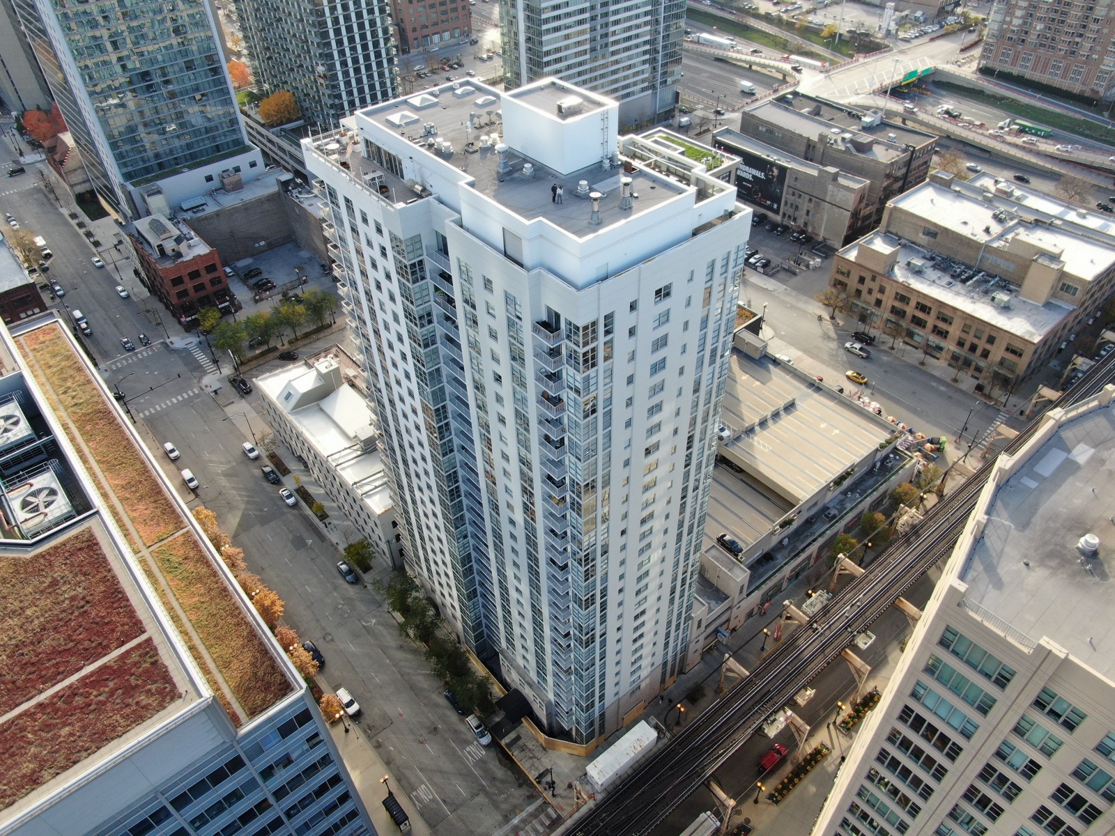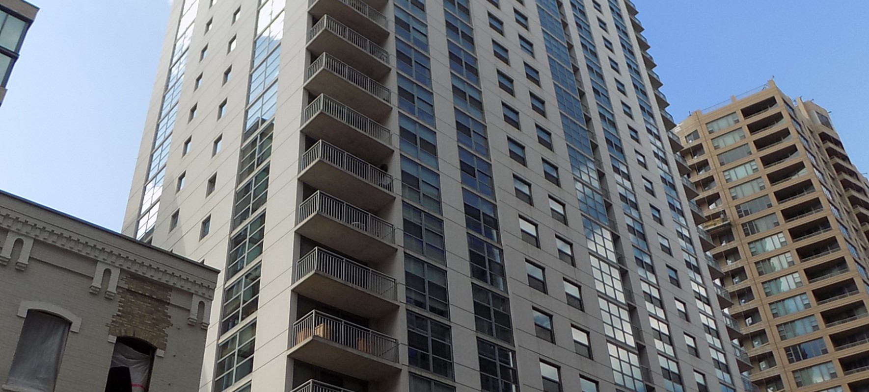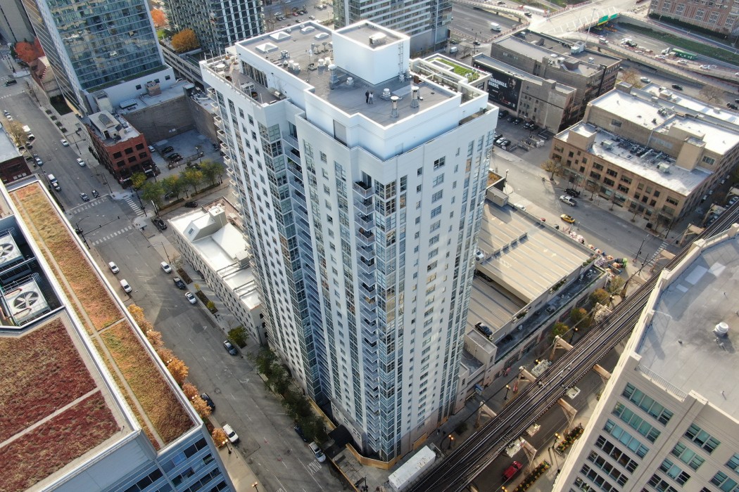 The 180 North Jefferson Apartments building is a twenty-eight story, 282-foot-tall concrete framed structure constructed circa 2003. The facade of the residential tower primarily consists of window walls set into rectangular openings defined by exposed concrete floor slab edges and columns. The exposed concrete surfaces on the facades are coated with a waterproofing coating. There are concrete slab balconies at the residential floors that originally did not have a waterproofing coating on their top surfaces.