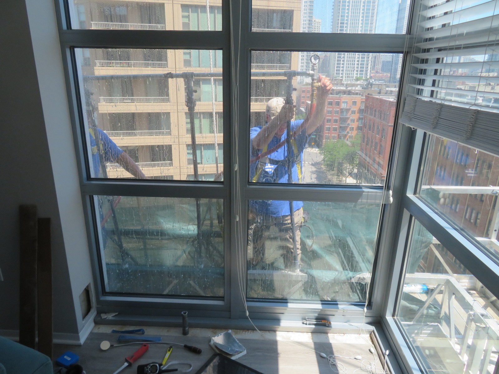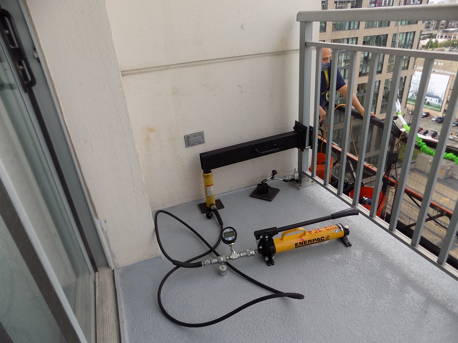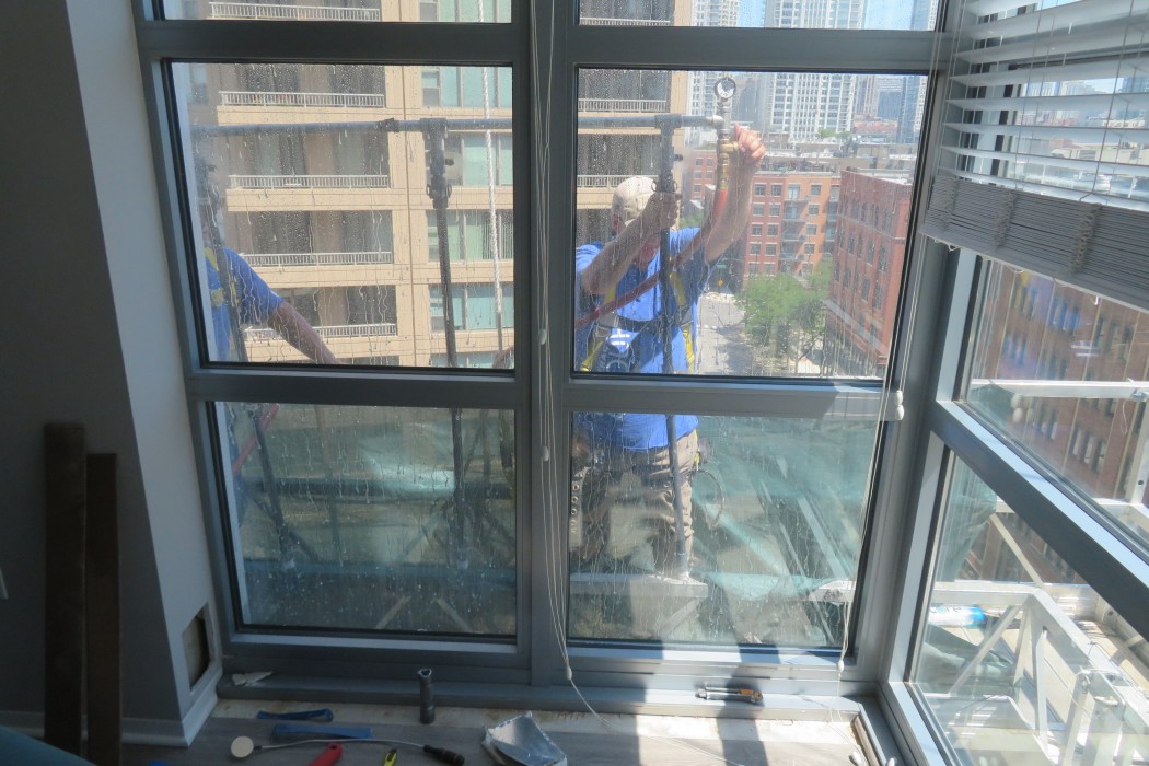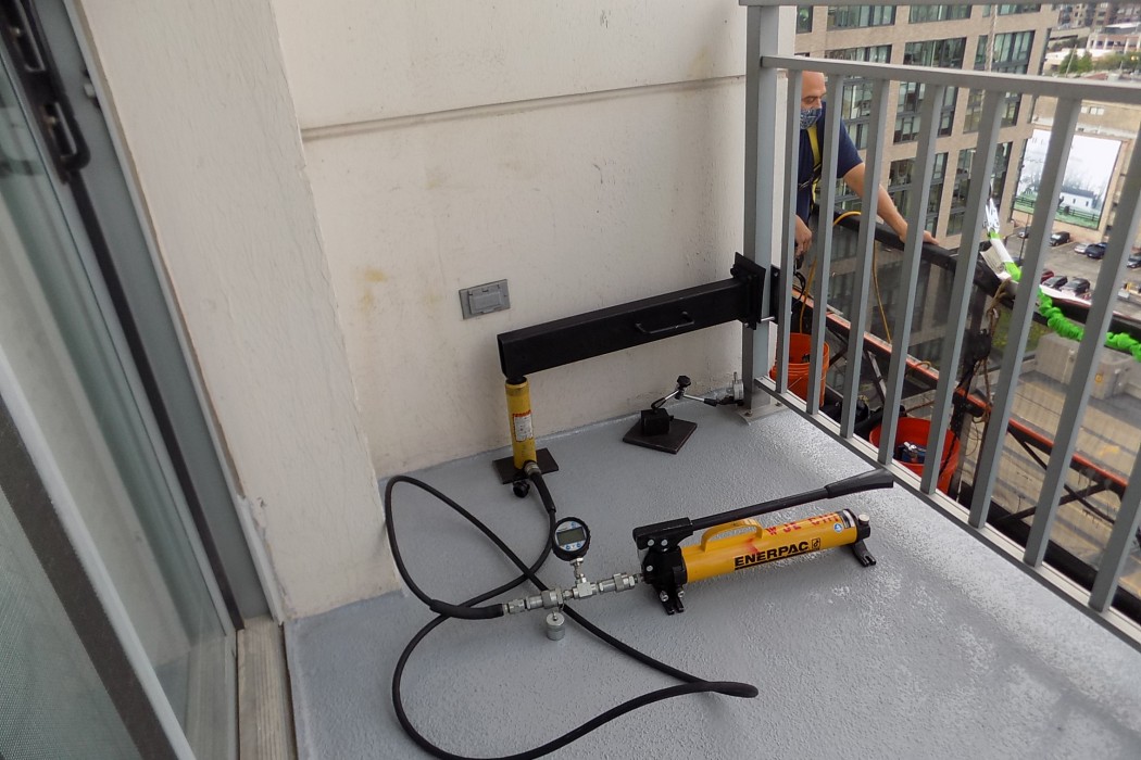 The facade repairs were performed from swing stages, and WJE performed construction observation of each drop at several milestones to document repairs and verify that the work was being performed in accordance with the details and specifications. WJE performed water testing and specified window sealant replacement at units with reported water leaks. WJE engineers also performed load testing of balcony railing posts with suspect anchor conditions to verify that they were capable of resisting the minimum factored design loads specified by the Chicago Building Code.