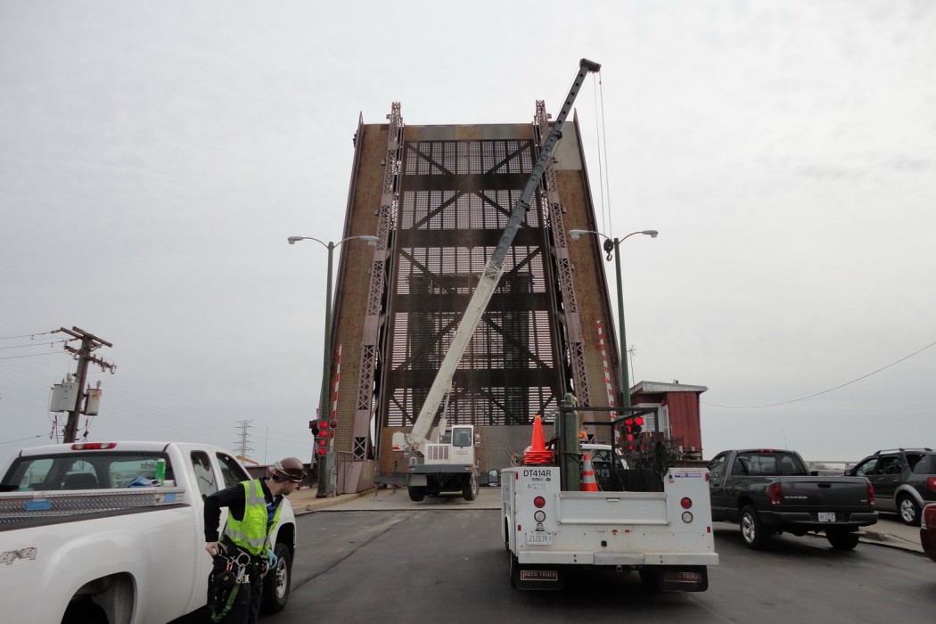 The west leaf was struck by vessels on several occasions, resulting in a reported misalignment between the southwest rack and pinion gear drive machinery. In order to operate the bascule leaf, the shaft attached to the southwest pinion gear was temporarily disengaged. The west leaf was subsequently driven only by the northwest rack and pinion.