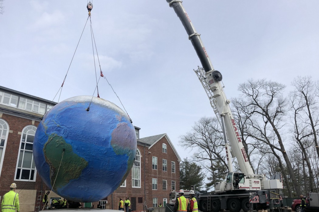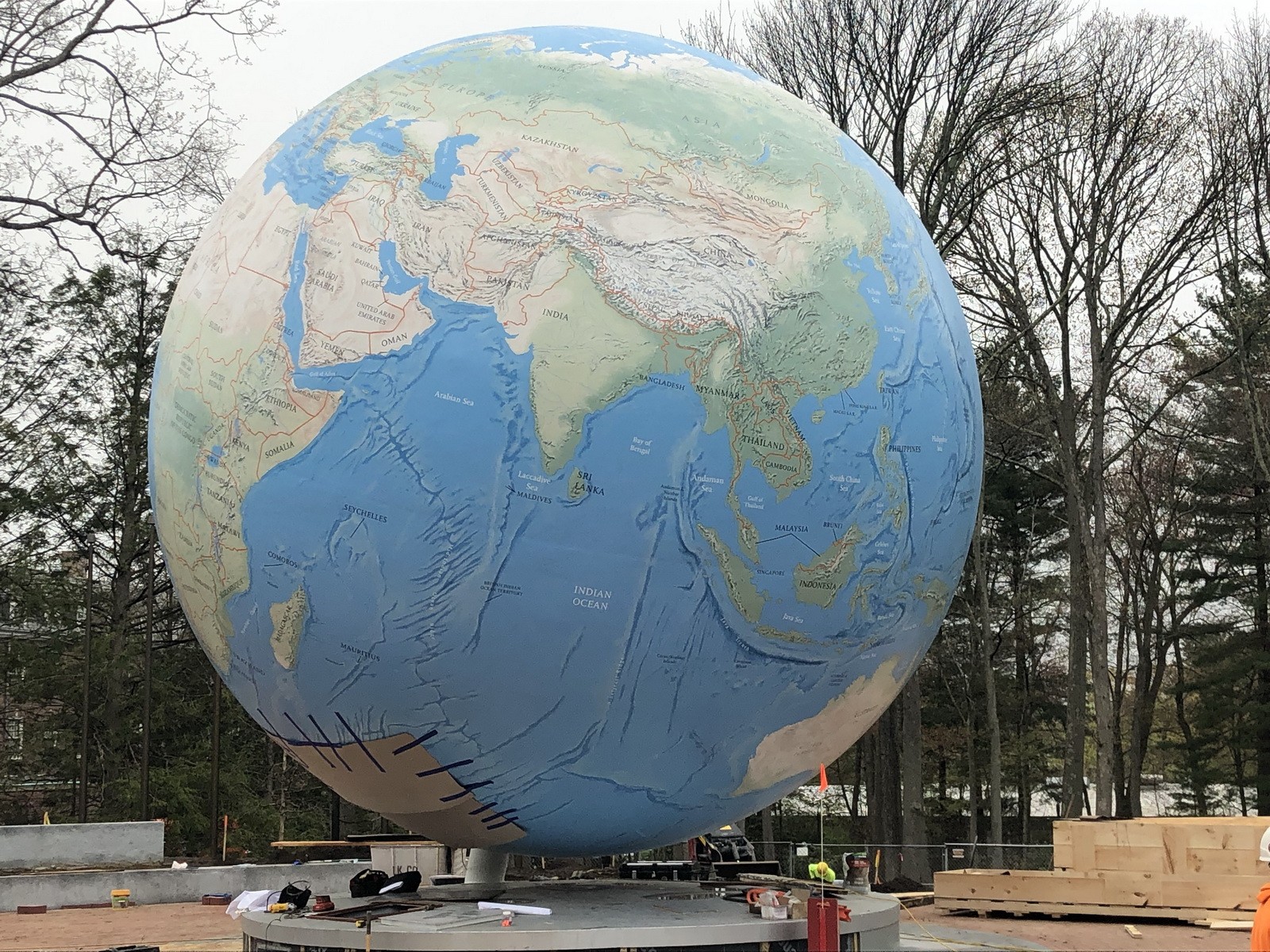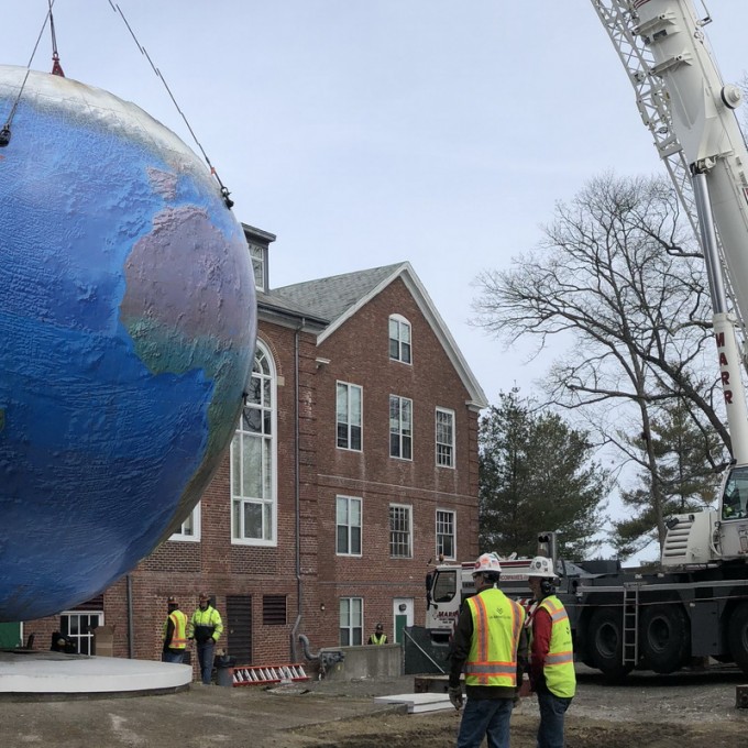 Located on the Babson College campus, the 28-foot-diameter, 25-ton Babson College Globe was originally engineered to rotate on its own axis. The operating machinery rotates the globe about the trunnion and rotates the trunnion and support structure to simulate the movement of the Earth as it orbits the sun. At the time of WJE's mechanical inspection, the historic heavy movable structure was undergoing a yearlong donor-funded restoration.