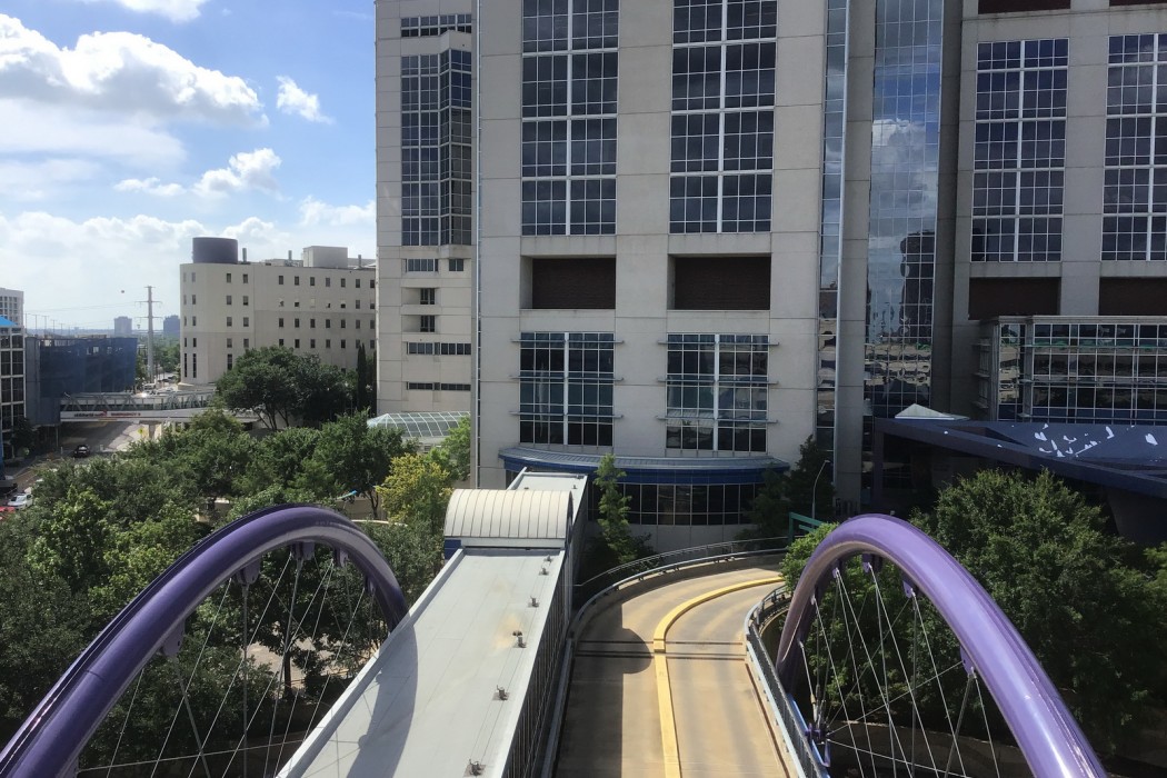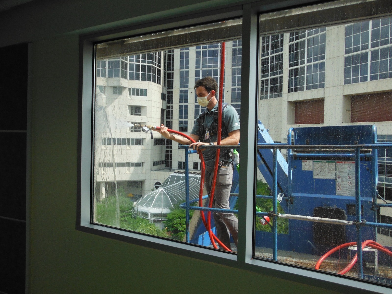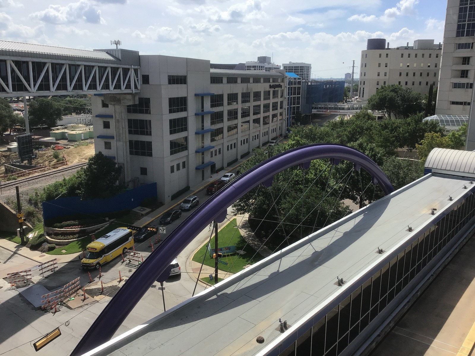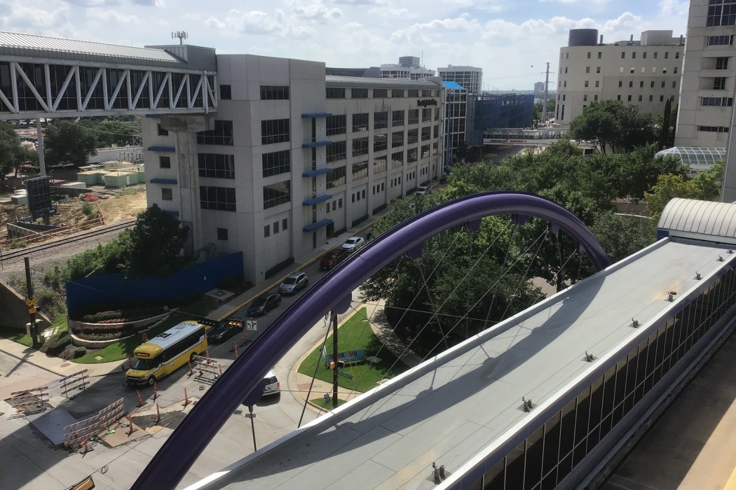 At the skybridges, WJE performed a condition assessment and water intrusion investigation at each skybridge. The condition assessment included both interior and exterior visual observations of each skybridge. Up-close exterior observations at Skybridges A and B were made by WJE’s Difficult Access Team, who accessed the facades using the specialty rail system.