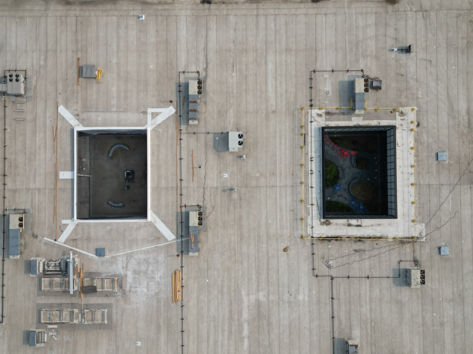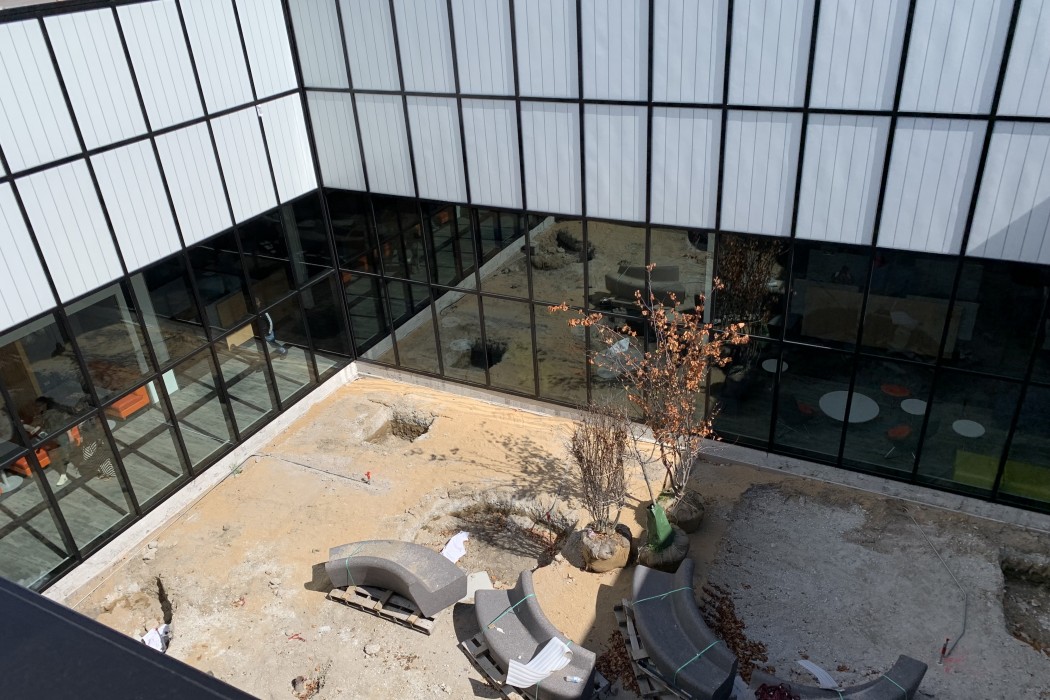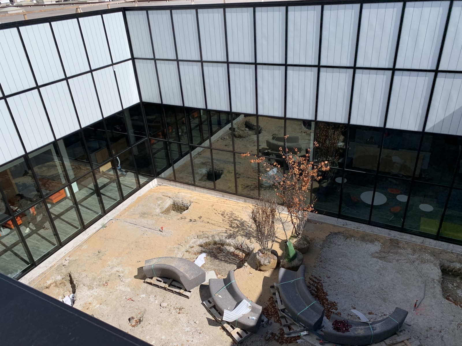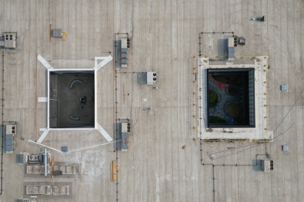 Two courtyards were constructed within the footprint of the original building to provide outdoor space and full floor to ceiling windows at the perimeter of the courtyard. The structural modifications included reconfiguration of the roof framing at the courtyard to create the opening, reconstruction of the column foundations below the frost line, and secondary framing to support the lateral loads of the storefront.