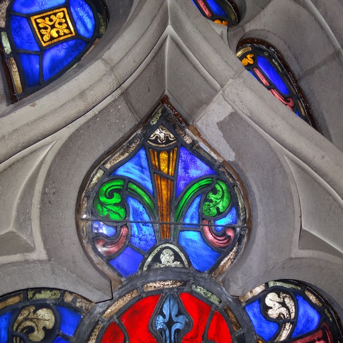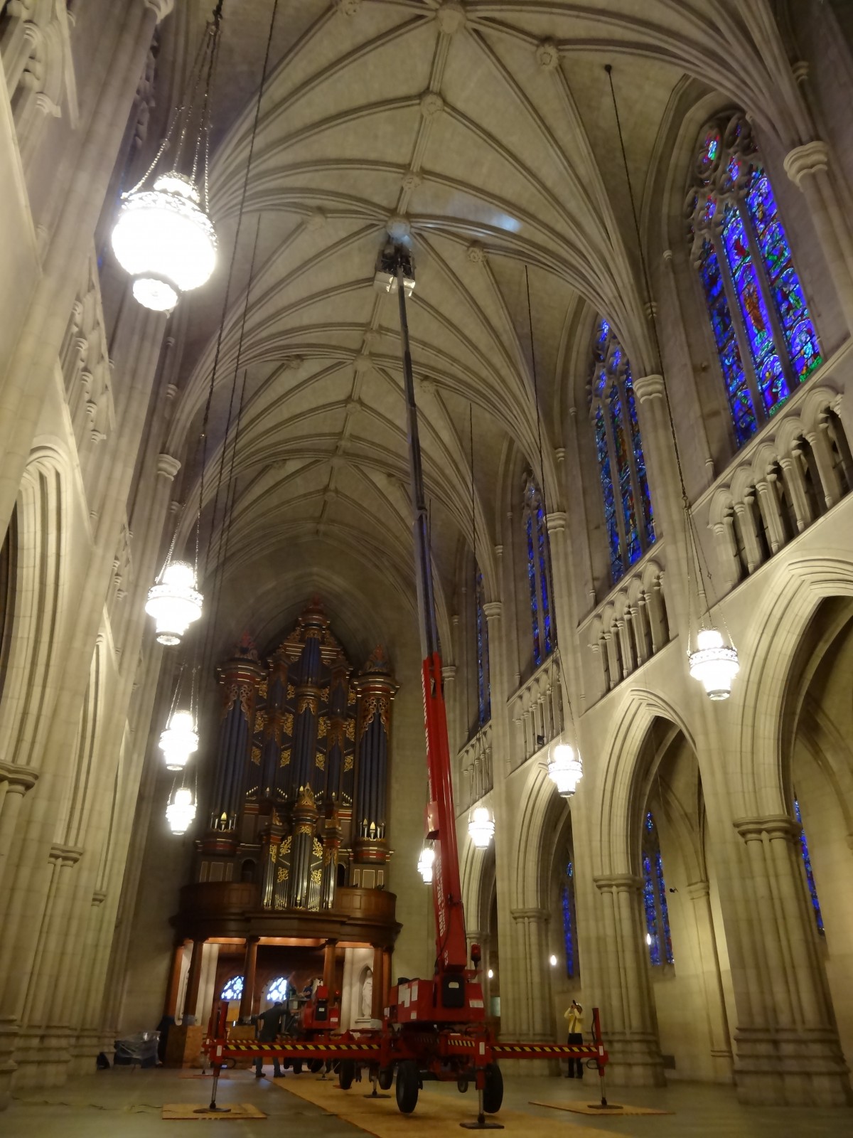 In the summer of 2012, a stone fragment from one of the stone ribs was discovered on the floor of the nave. The University erected scaffolding in the bay where the stone fragment was discovered and contacted WJE to perform an initial inspection of the vaulted ceiling system. Following the initial inspection, a close-up visual inspection was performed from lifts.