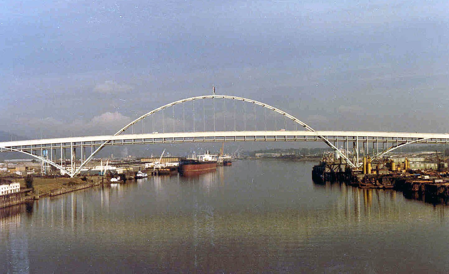 The Fremont Bridge is a three-span, stiffened steel arch bridge crossing the Willamette River, having a total length of 2,159 feet. The arch is designed to act in compression, and the tie girder acts in tension to counteract the thrust of the arch as well as in flexure to resist live-load bending moments. The main span consists of twenty-eight panels at 44 feet, 10 inches each for a total length of 1,255 feet 4 inches. The side spans consist of 10 panels at 44 feet, 10 inches each for a total of 448 feet, 4 inches.