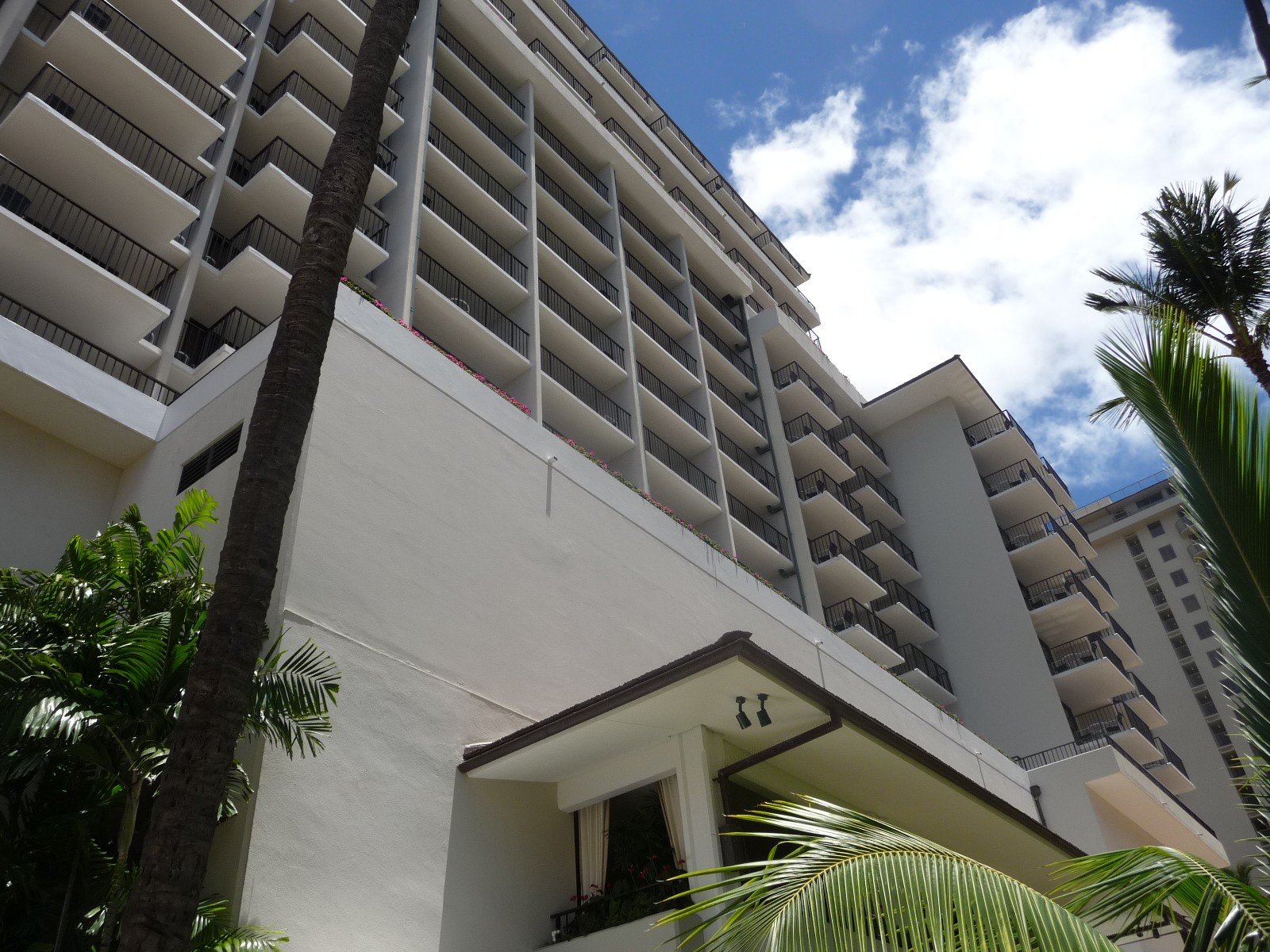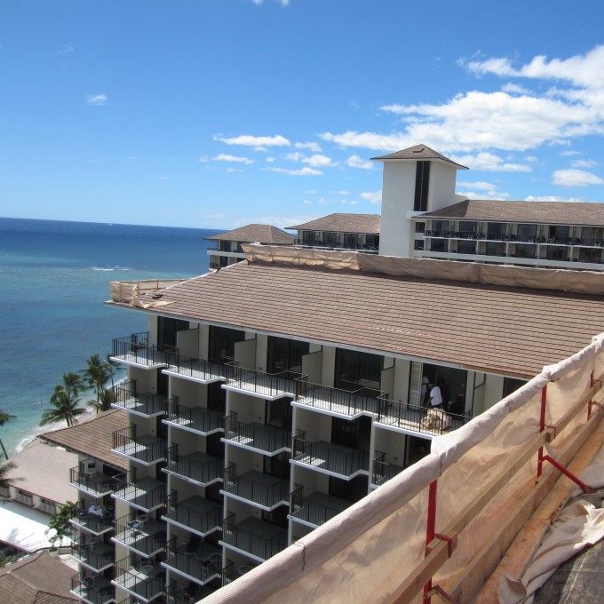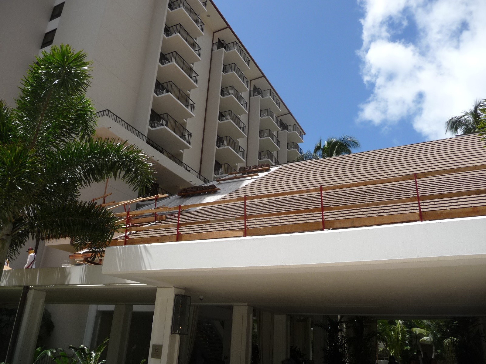 The Halekulani Hotel is a high-end luxury hotel situated on the Waikiki shore line. The hotel consists of multiple high-rise guestroom towers organized around courtyards with open-ended views to the adjacent oceanfront Waikiki boardwalk. The tower structural systems consist of a cast-in-place concrete frame and deck supporting steel-framed roofing substructure. The tower roofs vary in height from the inland side of the site to the ocean front property line to break down the massing of the towers and provide for framed views from guestrooms over the stepped towers steep slope roofs.