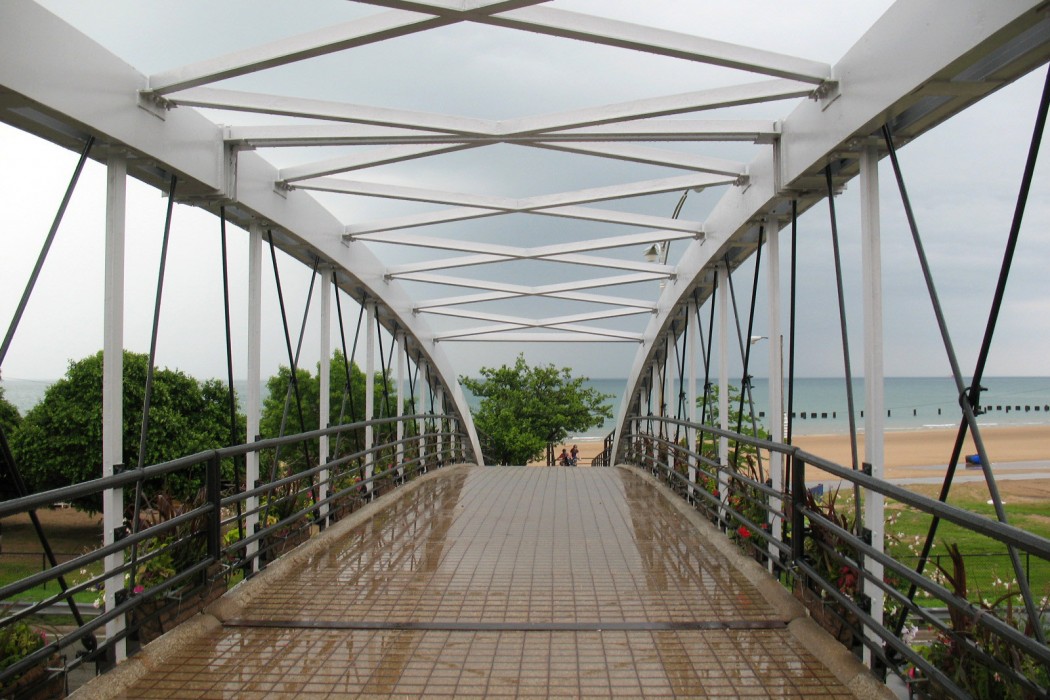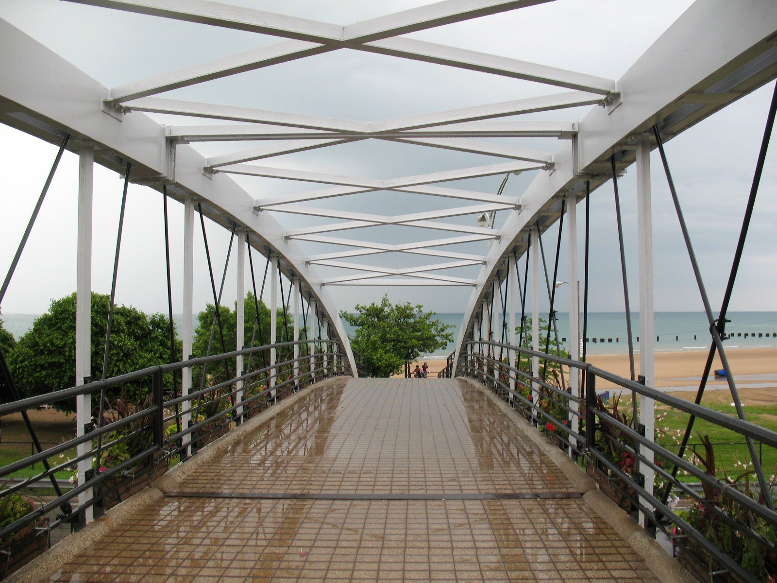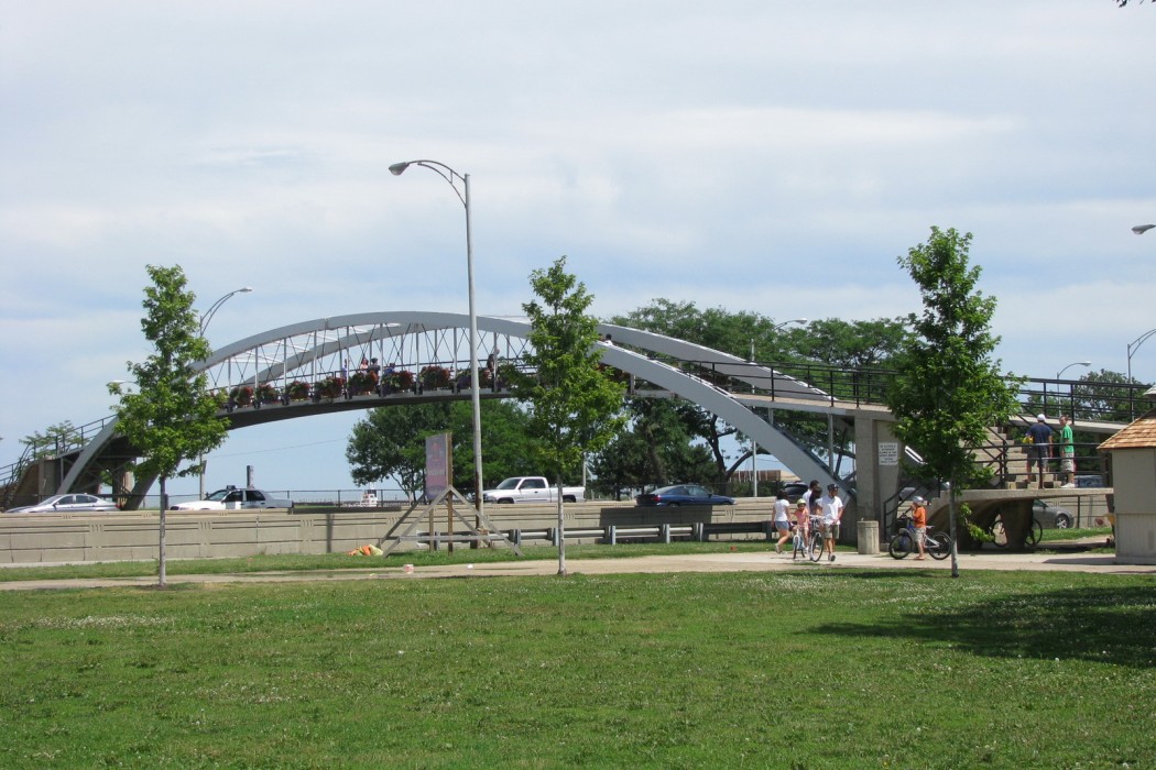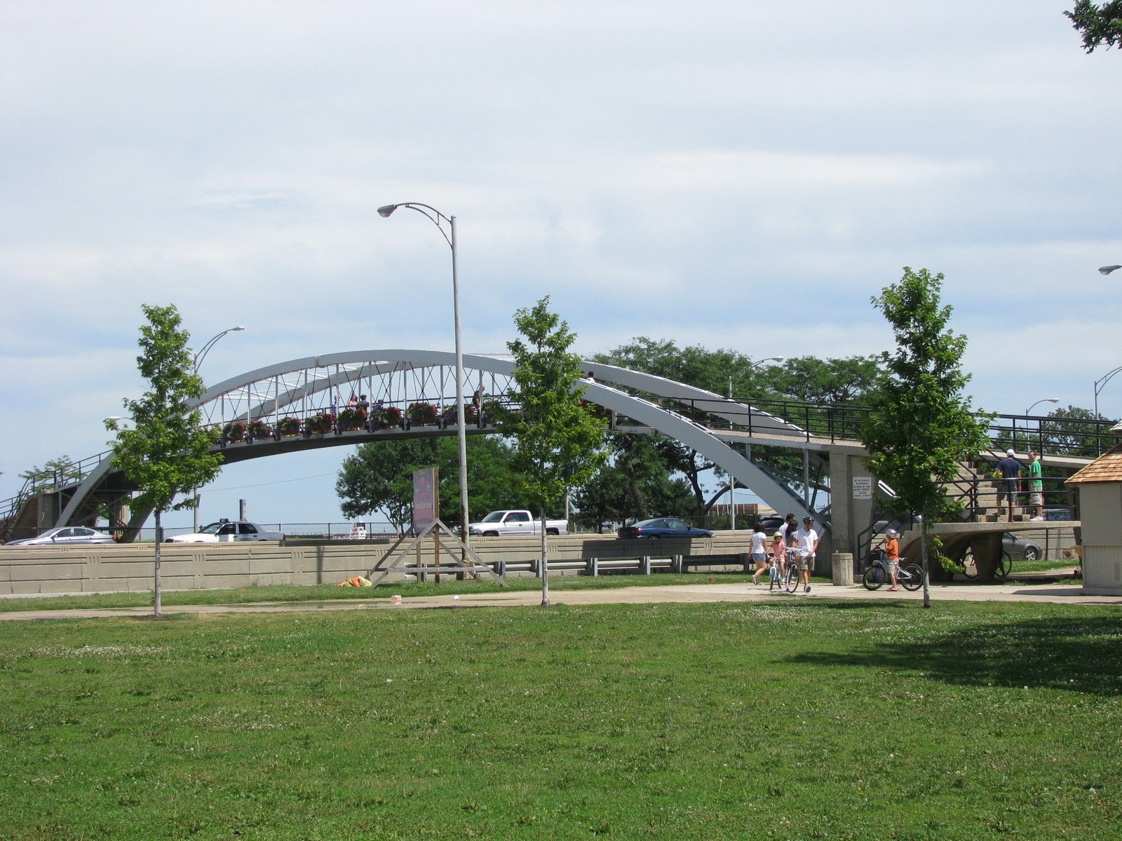 The Lincoln Park Pedestrian Bridge spans Lake Shore Drive, joining one of the City of Chicago’s largest parks and the Lincoln Park Zoo to the lakefront. The bridge is a three-hinged steel arch supporting a concrete-filled steel grid walkway by means of a series of hangers. Its span center-to-center of lower hinges is 189 feet. The width between the arch ribs is approximately 13 feet. The bridge was designed and constructed in the mid-1930s.