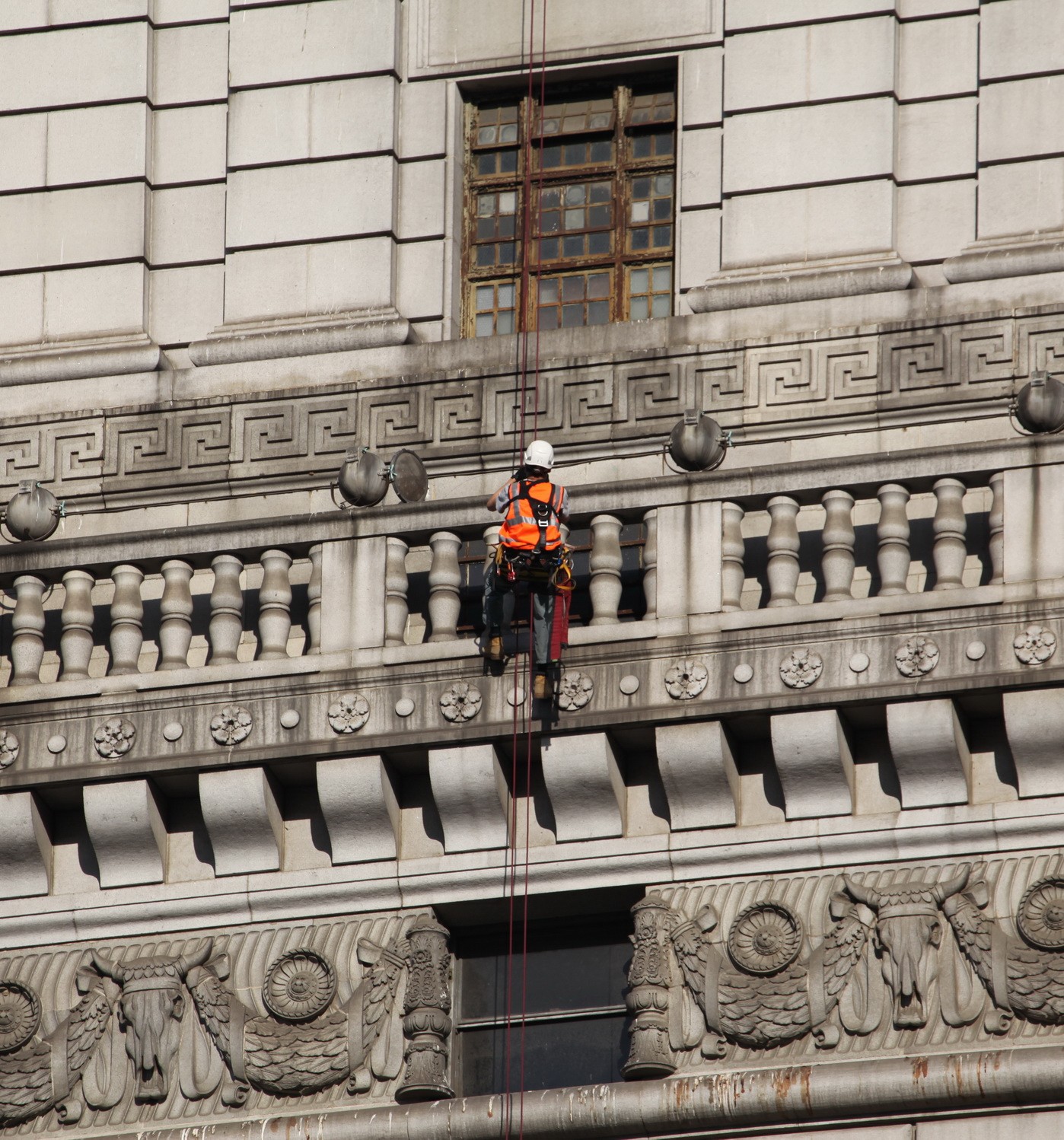 WJE completed a limited visual survey of the exterior masonry, fenestration, and copper roofing, documenting representative conditions from grade, the roof, and interior spaces. A 135-foot aerial personnel lift and industrial rope access techniques were used to perform close-up inspections of the granite and terra cotta portions of the facades, which revealed only minor weather-related deterioration. Seismic-related damage to the facade elements was isolated to weak stories at the eighth- and ninth-floor light courts: classic X-shaped shear cracking of glazed brick masonry infill walls was noted at these locations.