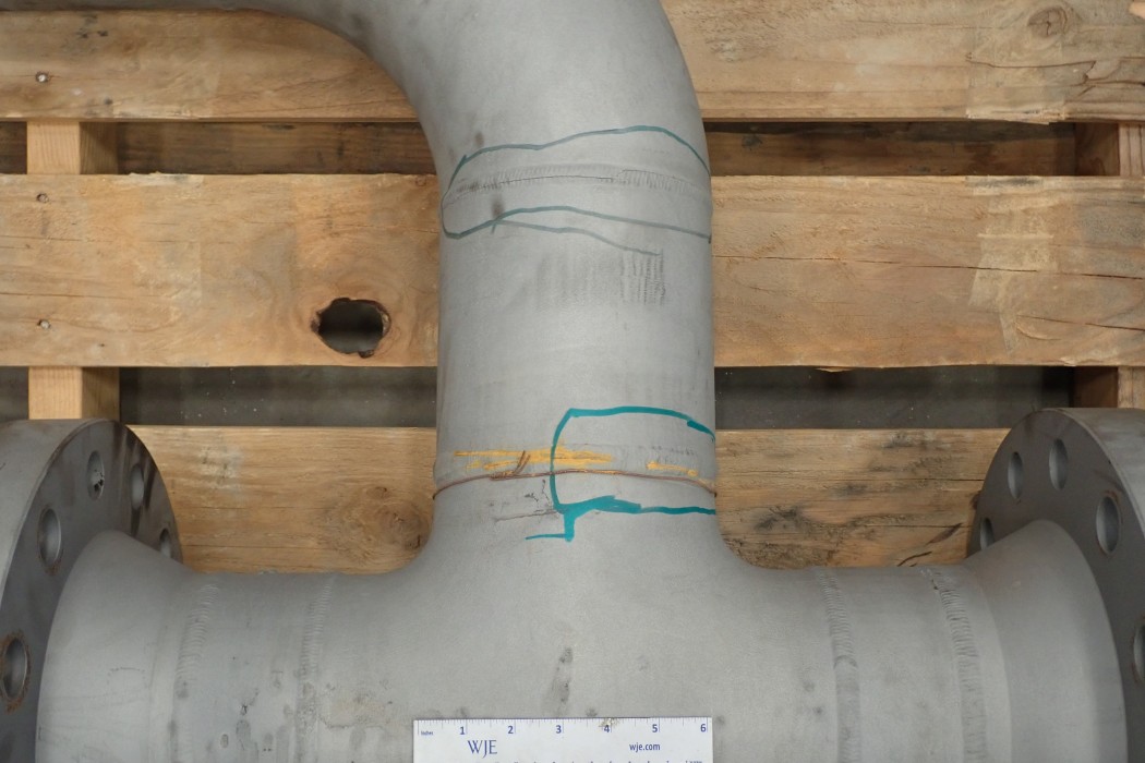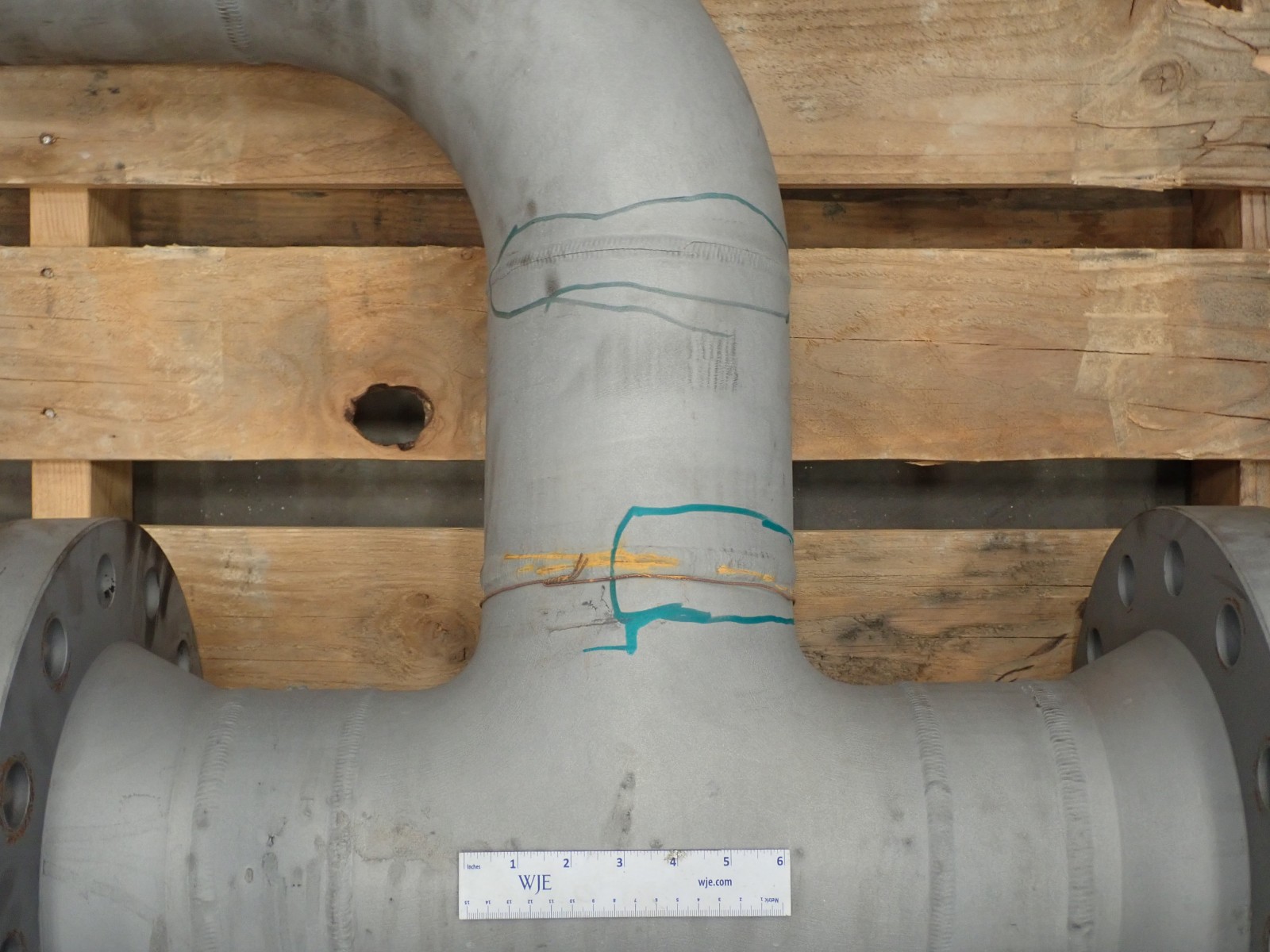 WJE was engaged to perform a metallurgical evaluation to determine the failure mechanism of the observed cracking in the pipe welds. Three stainless steel pipe components were received that had exhibited leaks. The components included two reducers and a tee-pipe with elbows. All observed leaks were identified as cracking in the circumferential weld region of the pipe components. The original pipe material was 304 stainless steel. The client had made several material changes in an effort to mitigate the leaks, which was assumed to be an environmental cracking problem.