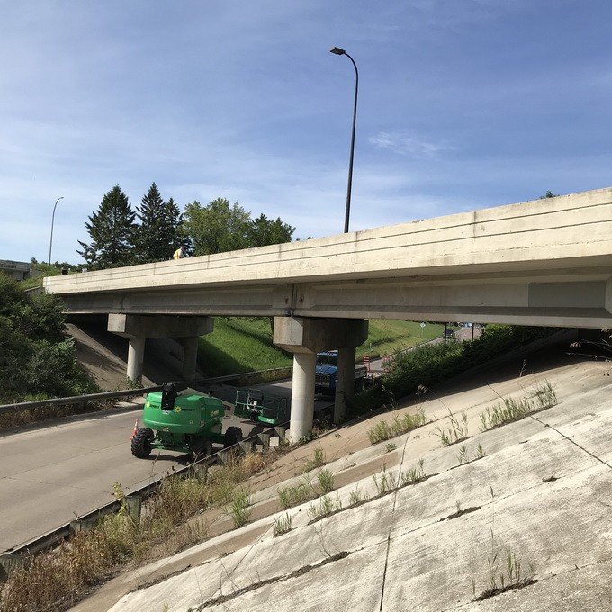 Minnesota Bridge No. 27099 carries Lyndale Avenue South over Hennepin Avenue in a downtown area of Minneapolis. The bridge was originally constructed in 1965 and has a total length of approximately 130 feet. There are three spans between the concrete abutments at each end of the bridge and two interior concrete bridge piers. Three precast, prestressed concrete I-girders support each span. The bridge was modified in 1989, including removal and replacement of the deck and edge railings, repairs to the abutments, and installation of a light pole attached to the west railing. Annual inspections by the City identified concrete distress that prompted WJE’s review.