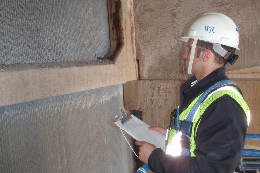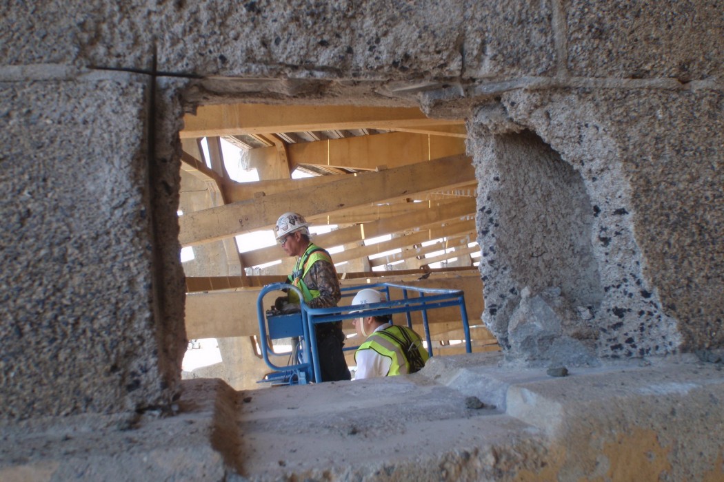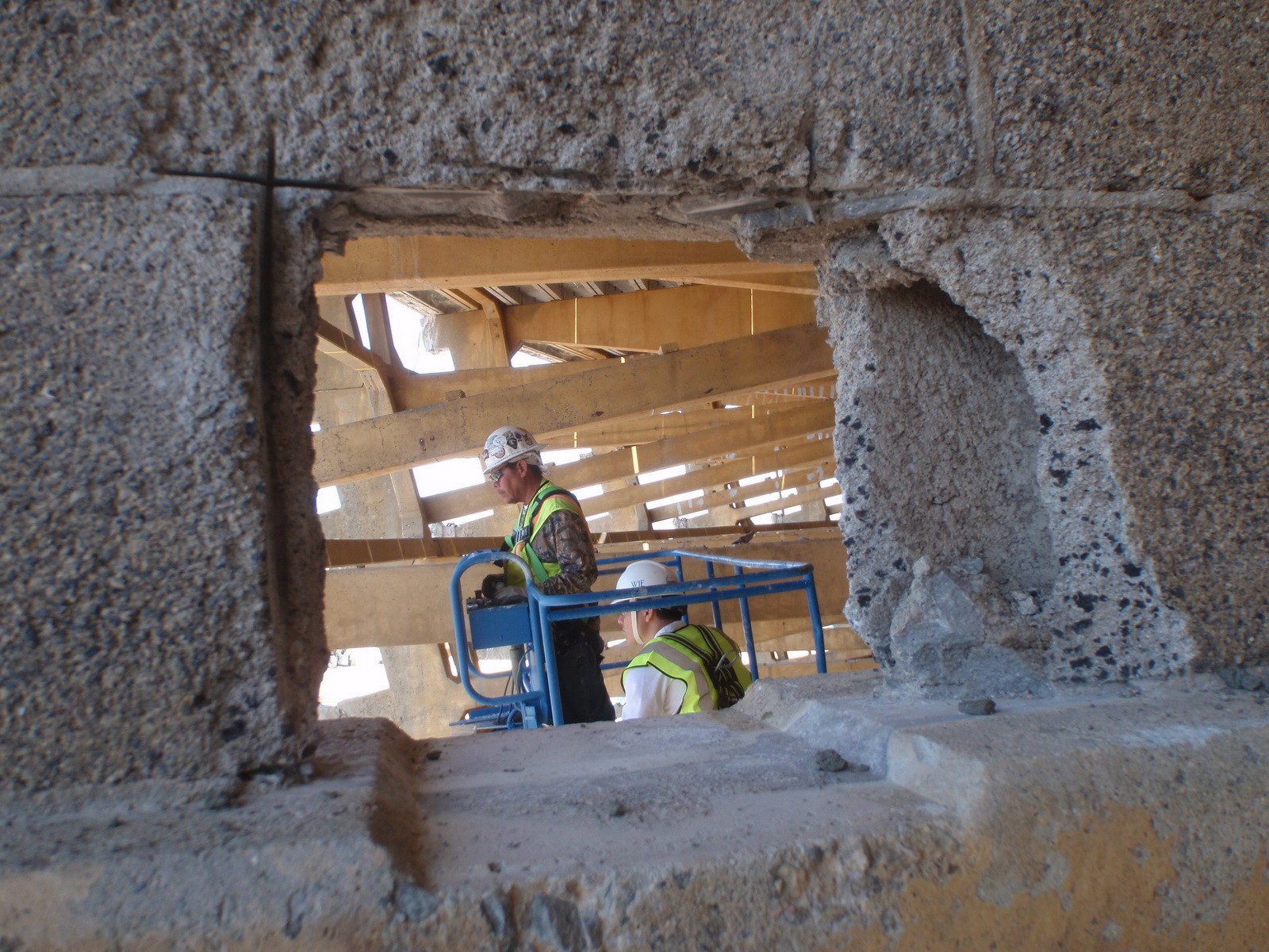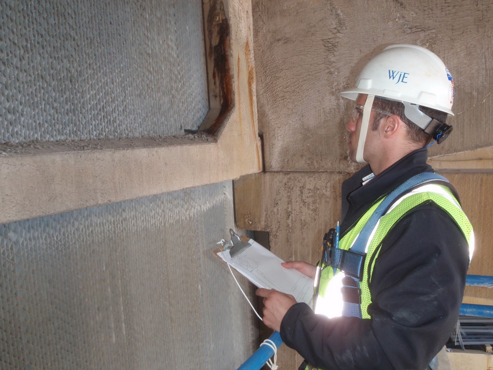 Each condition assessment performed by WJE engineers consisted of a visual survey and nondestructive testing of the radial bents and circumferential panels in the field as well as a laboratory study of material samples taken from selected elements observed. The field assessment included up-close tactile and from-grade cursory visual surveys, acoustic hammer sounding, making exploratory openings in select elements, and performing select nondestructive tests including a corrosion potential survey and corrosion rate testing. The laboratory study included performing chloride content testing on concrete powder samples obtained in the field. Through the field and laboratory studies, WJE engineers identified areas of the elements observed which exhibit greater corrosion induced deterioration and probabilities of ongoing corrosion. The engineers also made recommendations to APS regarding their current repair protocol as well as future repairs aimed at mitigating the progression of distress.