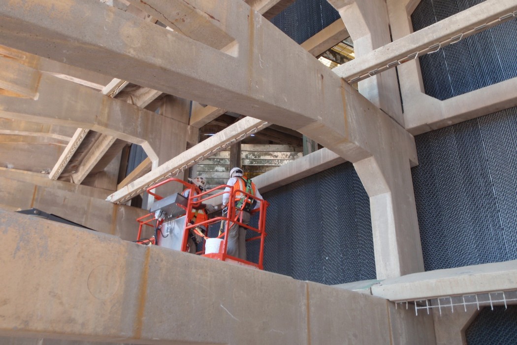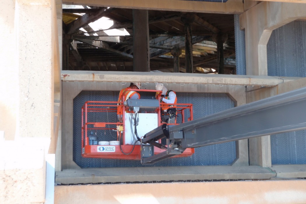 The mechanical draft cooling towers at Palo Verde Nuclear Generating Station have been in service for approximately twenty years, with a desired service life of an additional ten to fifteen years. To ensure the safe operation of these structures for the intended remaining service life, Arizona Public Service (APS) retained WJE to perform condition assessments of the structures twice a year over a multiyear period during scheduled outages and to identify characteristic distresses and provide repair recommendations.