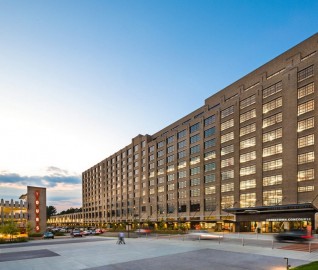 The Sears Crosstown was constructed in 1927 as a warehouse and catalog distribution center. Several additions were completed through 1965 and increased the building to 1.4 million square feet. The facade in the older portions of the building consists of mass brick masonry infill walls, while brick veneer with concrete masonry back-up walls are provided in the newer additions. The floor slab edge of the concrete-framed structure is partially exposed and forms the header for the window openings. Limestone accents are provided at window sills, parapets, and the top of masonry piers.