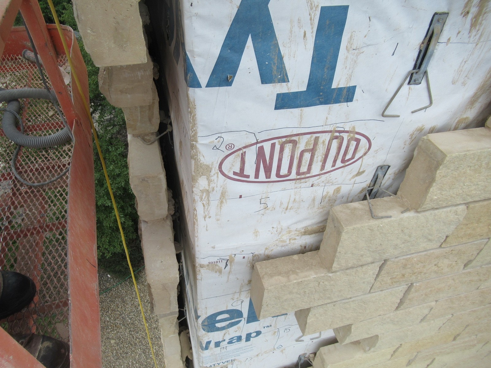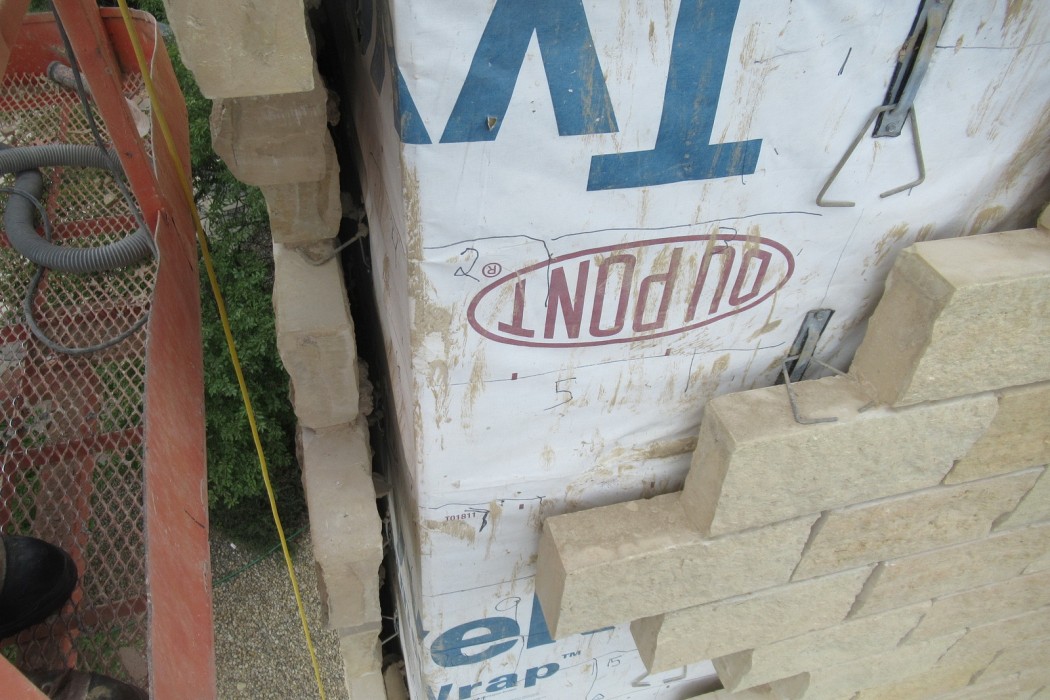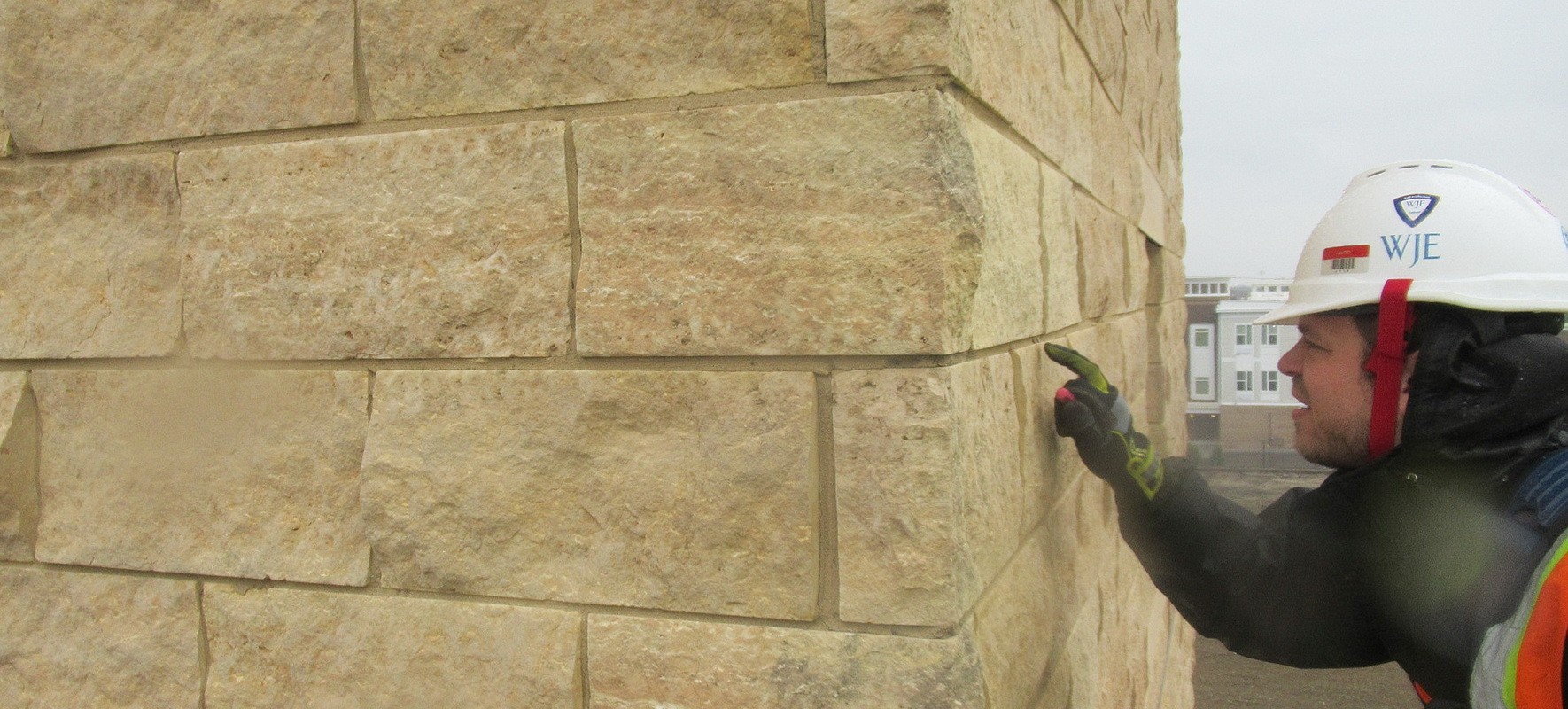 To investigate the cause of the displaced stone, WJE performed a site visit to survey the pattern of displacement and observe the investigative openings in the wall made by the general contractor. WJE also reviewed the original design documents to correlate observations with the intended design.