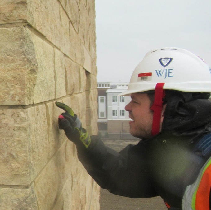WJE recommended removal and reinstallation of the displaced stone; installation of expansion joints through the thickness of the stone at locations consistent with the original drawings; and installation of anchors within eight inches of the corner, where rebuilt. In addition, WJE recommended repointing deteriorated and cracked mortar joints with a mortar compatible with the existing stone.