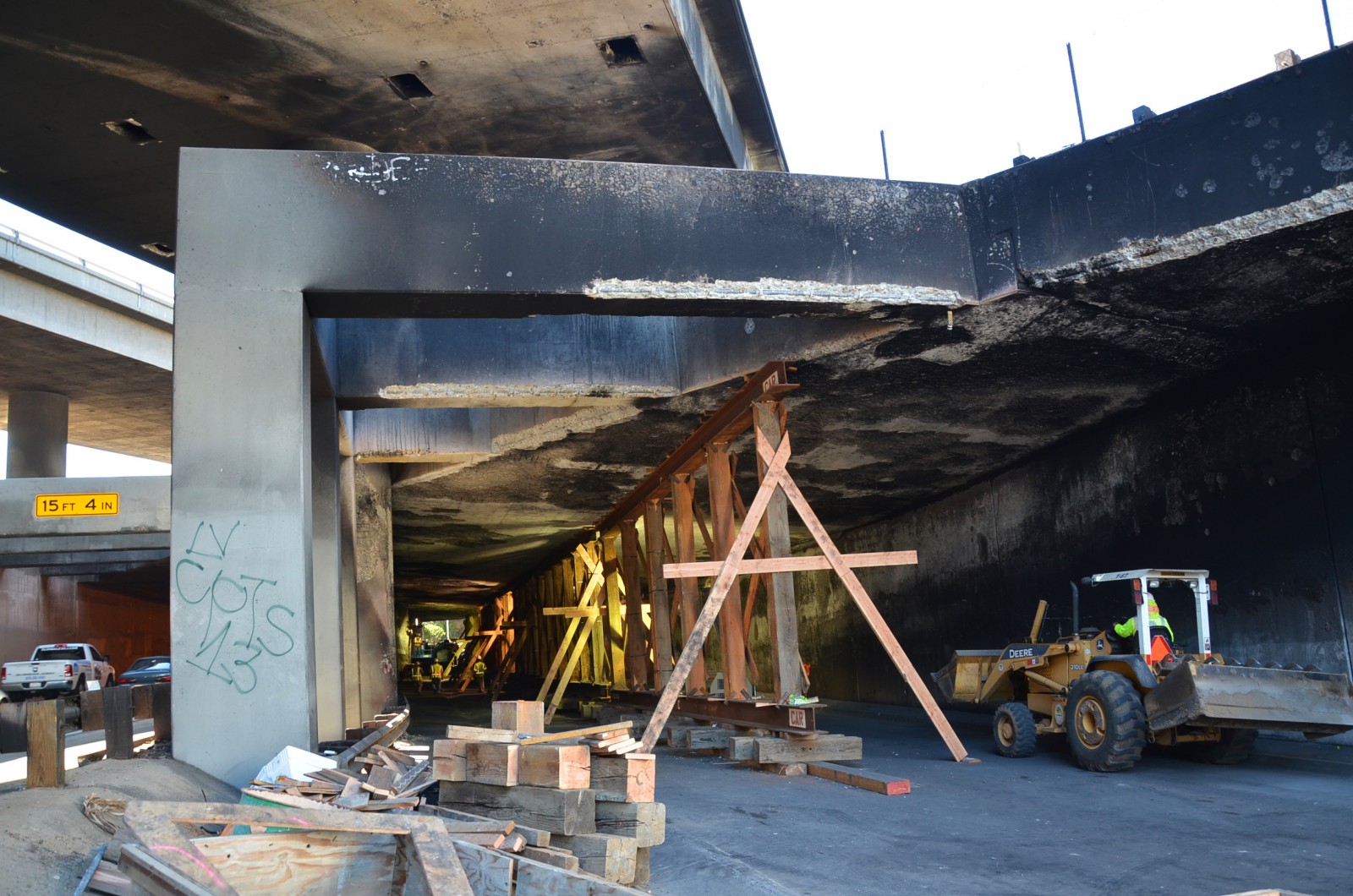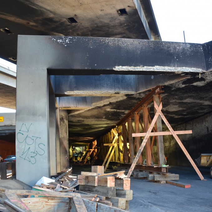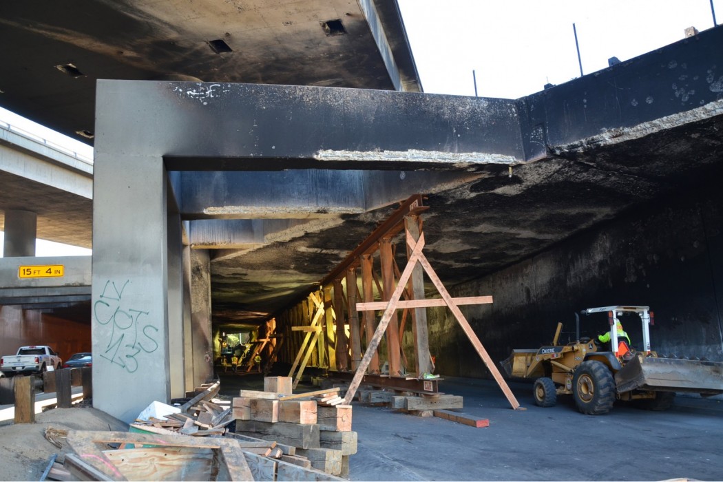 Though no injuries resulted from the accident, I-5, the main north-south freeway in California, remained closed until emergency crews could install shoring to support the damaged underpass. Concerned about the structural integrity of the underpass, Caltrans retained WJE to evaluate the structure, which consisted of cast-in-place, mild-steel-reinforced concrete members.