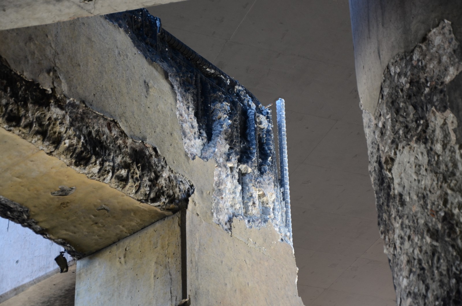The investigation determined that the walls and soffit of the underpass exhibited significant visible damage from the fire, consisting of spalling up to 4 inches deep. The two columns within the underpass also suffered a significant amount of visible spalling, exposing reinforcing steel at a few areas. IE testing and observations at core holes identified possible delaminations and heat damage. The upper deck had only minor fire damage with small areas of shallow spalling and material damage. However, compressive strength results indicated that the undamaged concrete appeared to significantly exceed the original design strength requirement.