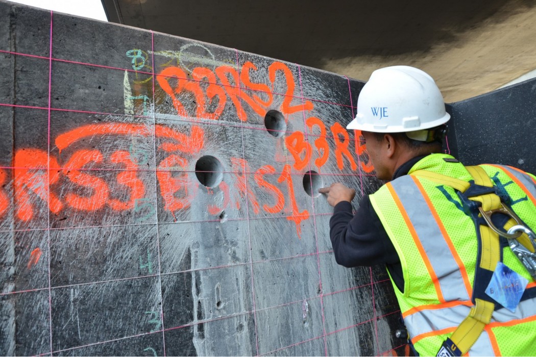 WJE's investigation consisted of two phases. During Phase 1, the structure was visually inspected, and core samples were removed from the walls, soffit, beams, and columns in areas exhibiting a range of conditions. In Phase 2, the structural elements were subjected to impact-echo (IE) testing to detect delaminations and locate internal cracks. Inspection core holes were used to calibrate and verify impact-echo results.